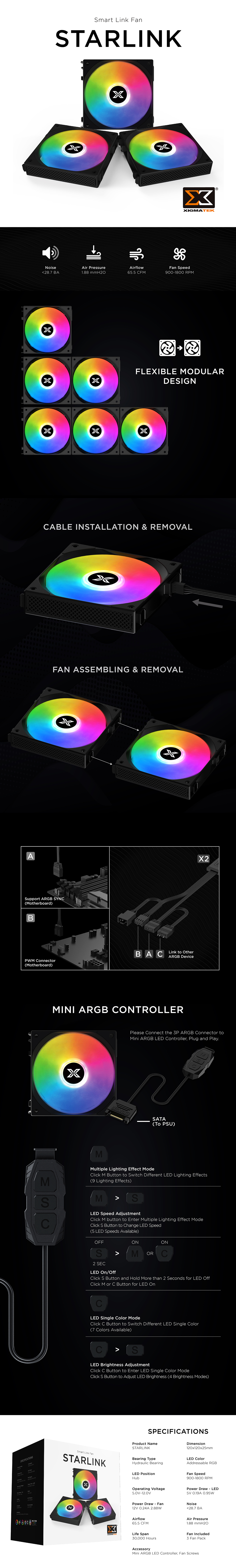 Starlink (3PCS Black Easy Clip On & Smart Link Fan,2PCS ARGB & PWM Cable,Mini ARGB Controller,Color Box)
